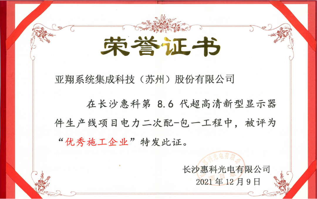 在整個(gè)施工過程中,項(xiàng)目團(tuán)隊(duì)人員實(shí)行精細(xì)化管理,對重難點(diǎn)的施工,積極會(huì)同惠科光電專業(yè)工程師溝通討論并確認(rèn)方案,嚴(yán)格執(zhí)行公司安全質(zhì)量管理標(biāo)準(zhǔn),保質(zhì)保量順利完成項(xiàng)目節(jié)點(diǎn)目標(biāo);后續(xù)電力二次配系統(tǒng)運(yùn)行平穩(wěn),得到了業(yè)主的肯定和贊譽(yù),并獲得了業(yè)主頒發(fā)的“優(yōu)秀施工企業(yè)”榮譽(yù)證書,在此由衷的感謝長沙惠科光電對亞翔集成的認(rèn)可!