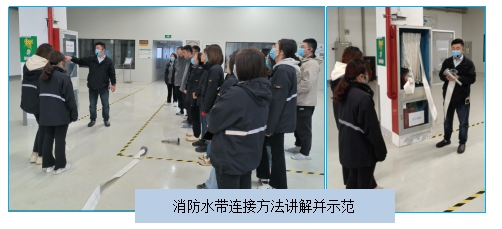 現場指揮馮工講解并示范了消防水帶的連接方法及使用方法。隨后員工進行消防水帶的連接實操,實操完畢,由搶險救援組同仁配合進行了消防水帶噴水實操,各位同仁積極參與實操演練環節。
