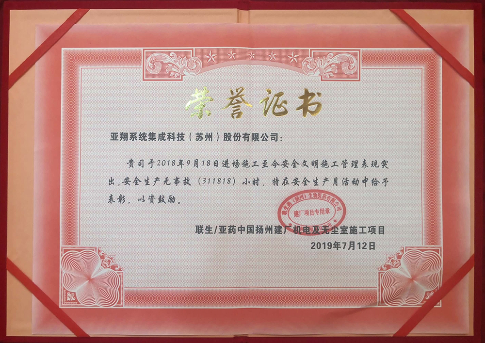 20190712獲揚州聯生聯亞安全無事故311818小時表彰