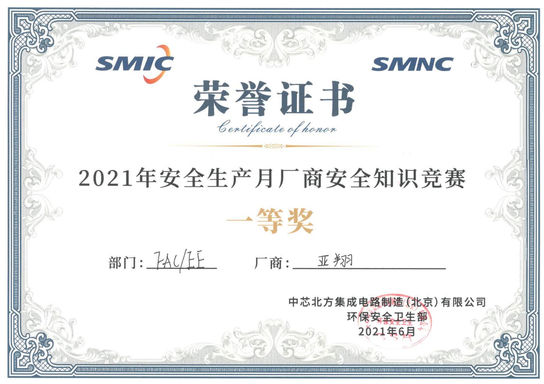 20210629獲北京中芯-2021年安全生產月廠商知識競賽榮譽證書