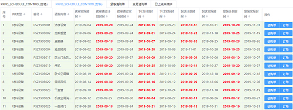 設(shè)備資料請購與勞務(wù)分包方面,已將原有的PR/PO Control ListEXCEL表格上“雲(yún)”,除了專案負(fù)責(zé)人維護(hù)所有請購單的流轉(zhuǎn)節(jié)點(diǎn)計(jì)畫日期外,系統(tǒng)也能自動(dòng)匹配到各請購單流轉(zhuǎn)節(jié)點(diǎn)的實(shí)際流轉(zhuǎn)日期,採購承辦填寫的實(shí)際下訂日期以及專案負(fù)責(zé)人填寫的實(shí)際到場日期與安裝日期。當(dāng)實(shí)際值與計(jì)畫值出現(xiàn)較大偏差時(shí),系統(tǒng)也能自行返紅色字體,以利管理者能夠迅速聚焦有較大異常的請購單,並及時(shí)採取干預(yù)或補(bǔ)救措施。