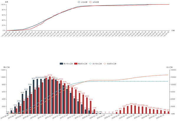 當(dāng)工程雲(yún)平臺中有了施工進(jìn)度和上工數(shù)據(jù)之後,系統(tǒng)圖表自動(dòng)呈現(xiàn)出當(dāng)前施工進(jìn)度的計(jì)畫值與實(shí)際值,周上工數(shù)的計(jì)畫值與實(shí)際值以及S-curve曲線的計(jì)畫值與實(shí)際值對照圖。管理者通過圖表能夠快速識別出當(dāng)前工期的滯後問題是否與工人的上工數(shù)有所關(guān)聯(lián),若是上工人力不足則能迅速發(fā)出新增人力之指令,避免施工進(jìn)度滯後問題遲遲不能得到解決。