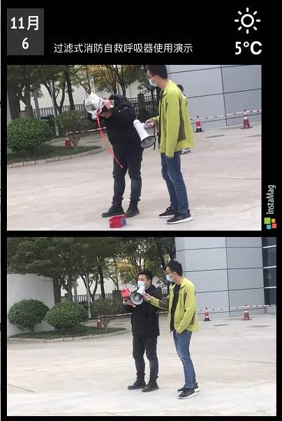 針對火場逃生自救裝置,現場指揮現場講解過濾式自救呼吸器使用方法及注意事項,並進行演示佩戴。