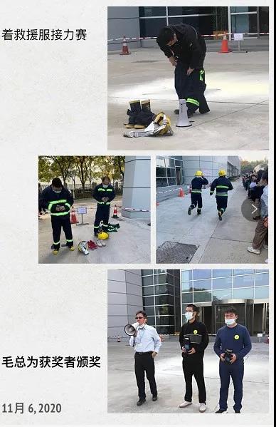 穿消防服接力競賽是本次演練的最大看點,選手們經過激烈角逐,最終設計處兩位同仁以2分36秒的成績獲得本次比賽第一名。毛總親自為本次競賽獲獎者頒發了獎品。