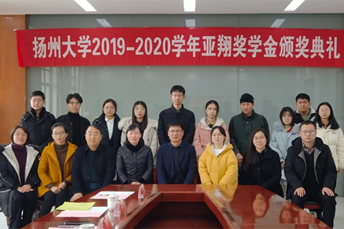 2020年12月18日上午,亞翔獎學金頒獎典禮在揚州大學揚子津校區知行樓舉行。公司資深經理吳小風、揚州大學學生工作部副部長、資助中心主任王華、機械工程學院黨委副書記張平、電力與能源動力工程學院黨委副書記陳春霞、環境科學與工程學院黨委副書記張鋒等人出席了本次頒獎典禮。